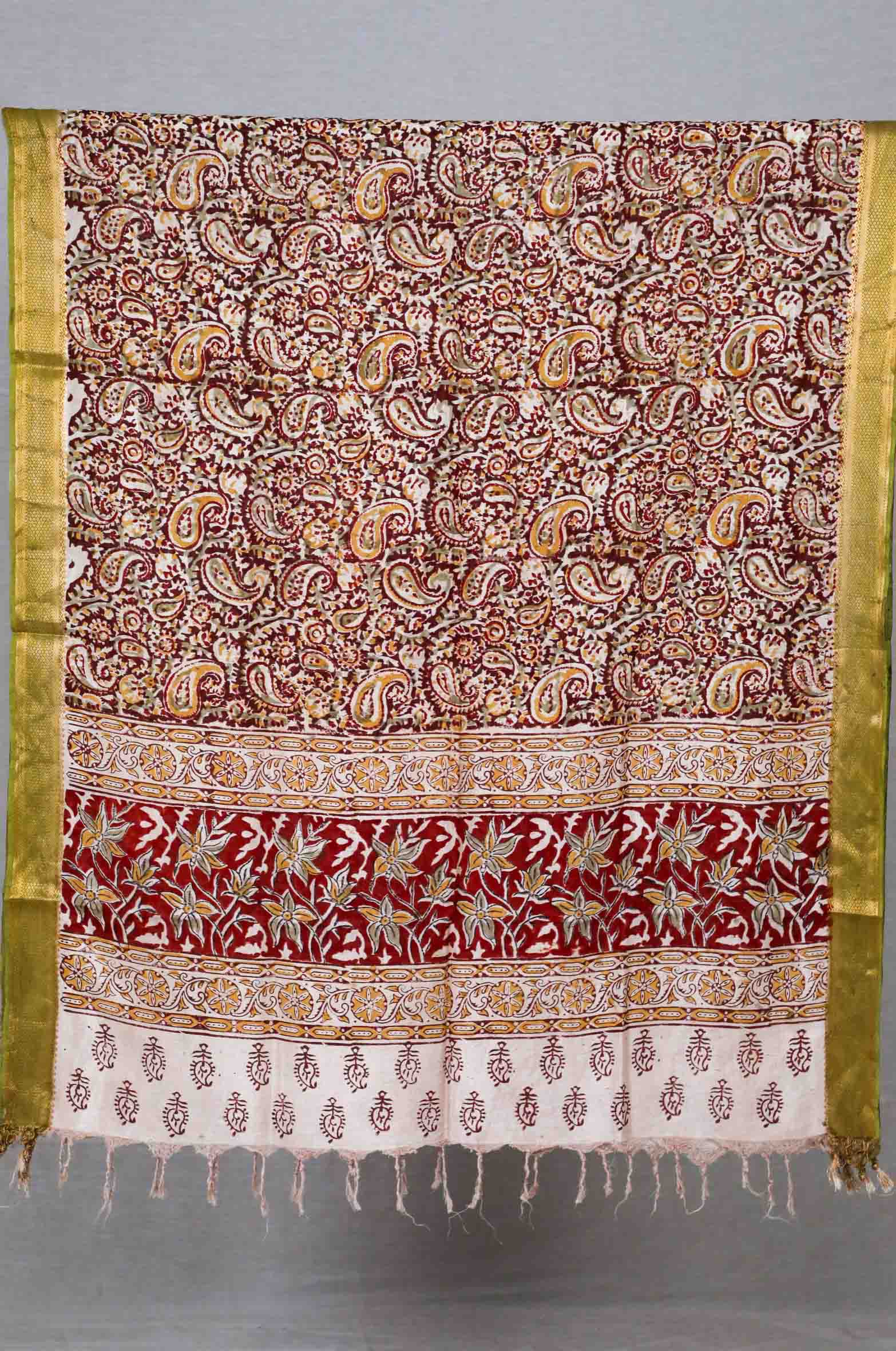 - Classic woven texture meets handcrafted artistry in our Hand woven Mangalgiri nizam border ,Top paired with a Block Print Kalamkari Cotton Silk Dupatta.