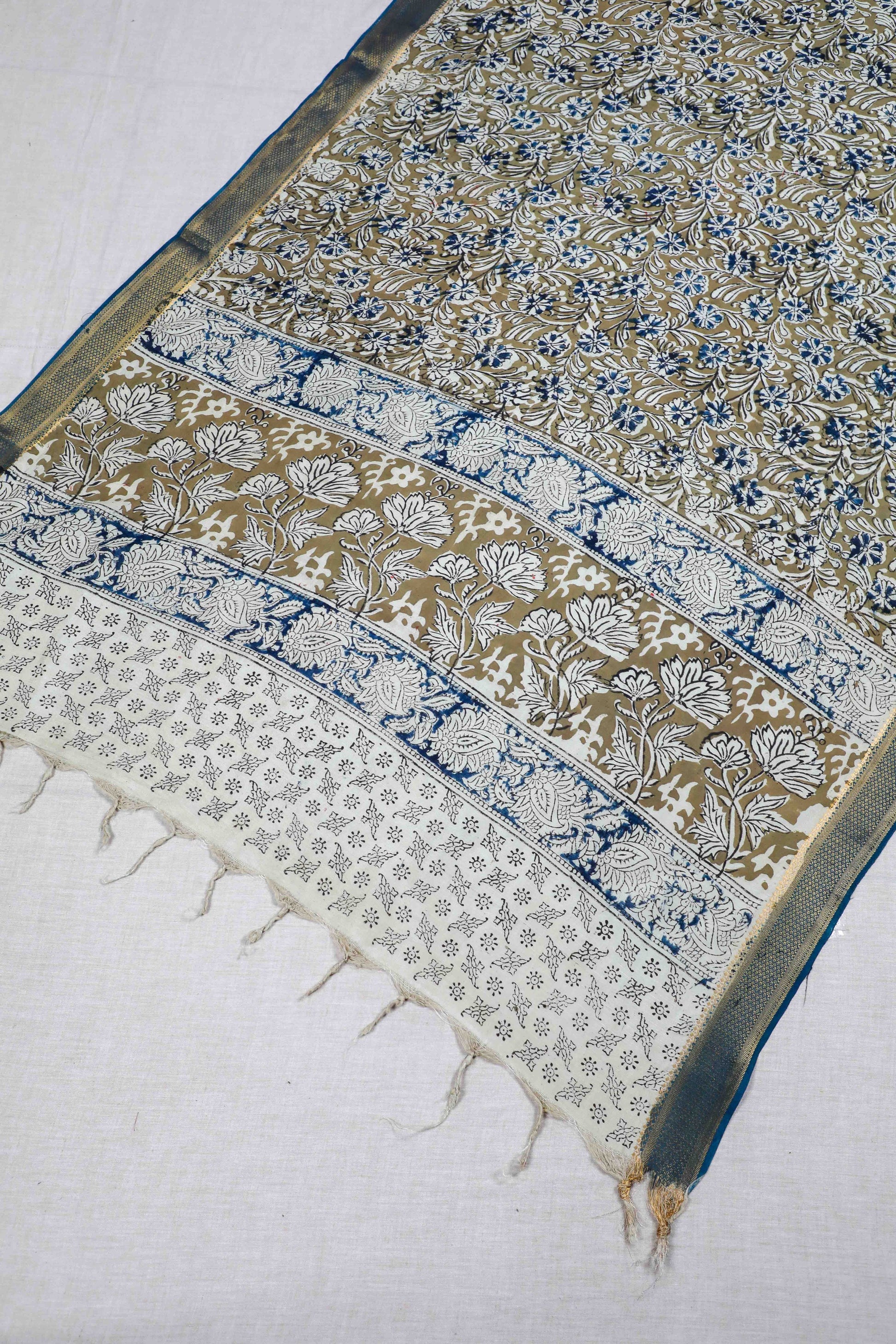- Experience premium festive refinement with our Mangalgiri Silk Block Printed Kalamkari Dupatta featuring a Zari Woven Border, Crafted using natural organic colors. Structured drape, vibrant block-printed motifs, and shimmering border detailing.