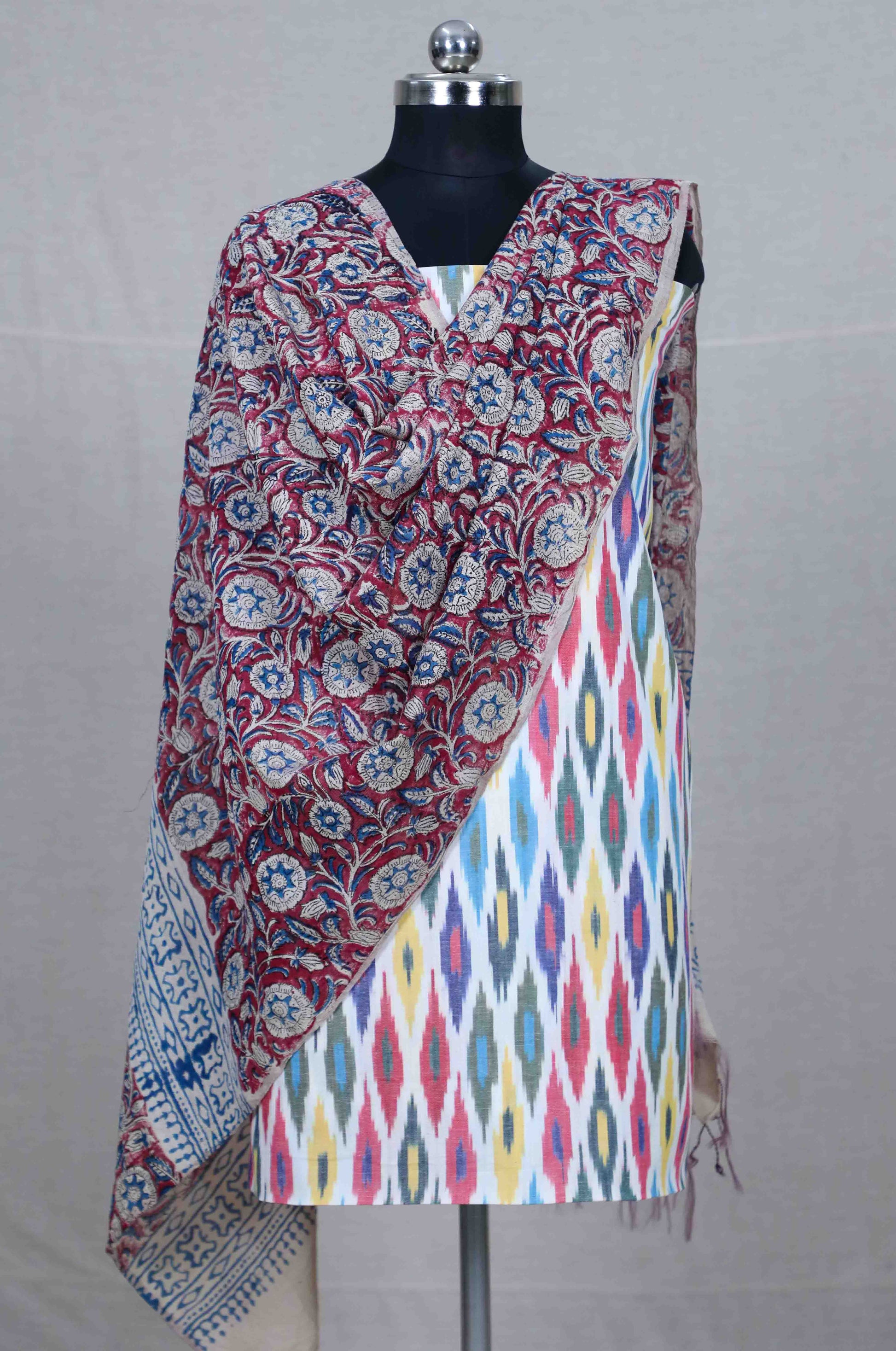 - Experience relaxed refinement with our Handloom Ikat ,Top paired with a Semi-Linen Kalamkari Cotton Dupatta, crafted for natural texture and breathable elegance.