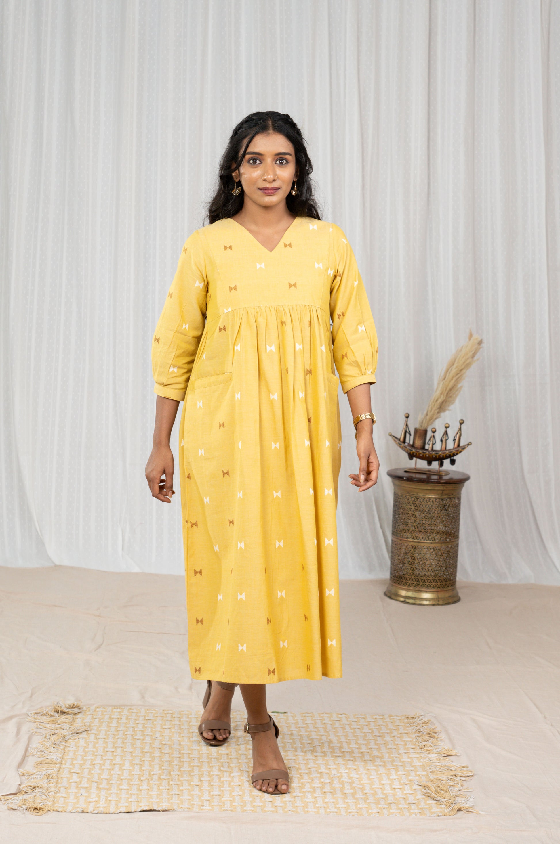 Design: This pleated yoke dress with three fourth cuff pleate sleeve is a beautiful dress with two front pockets, back pleate and relaxed fit which keeps you comfortable and stylish at once.