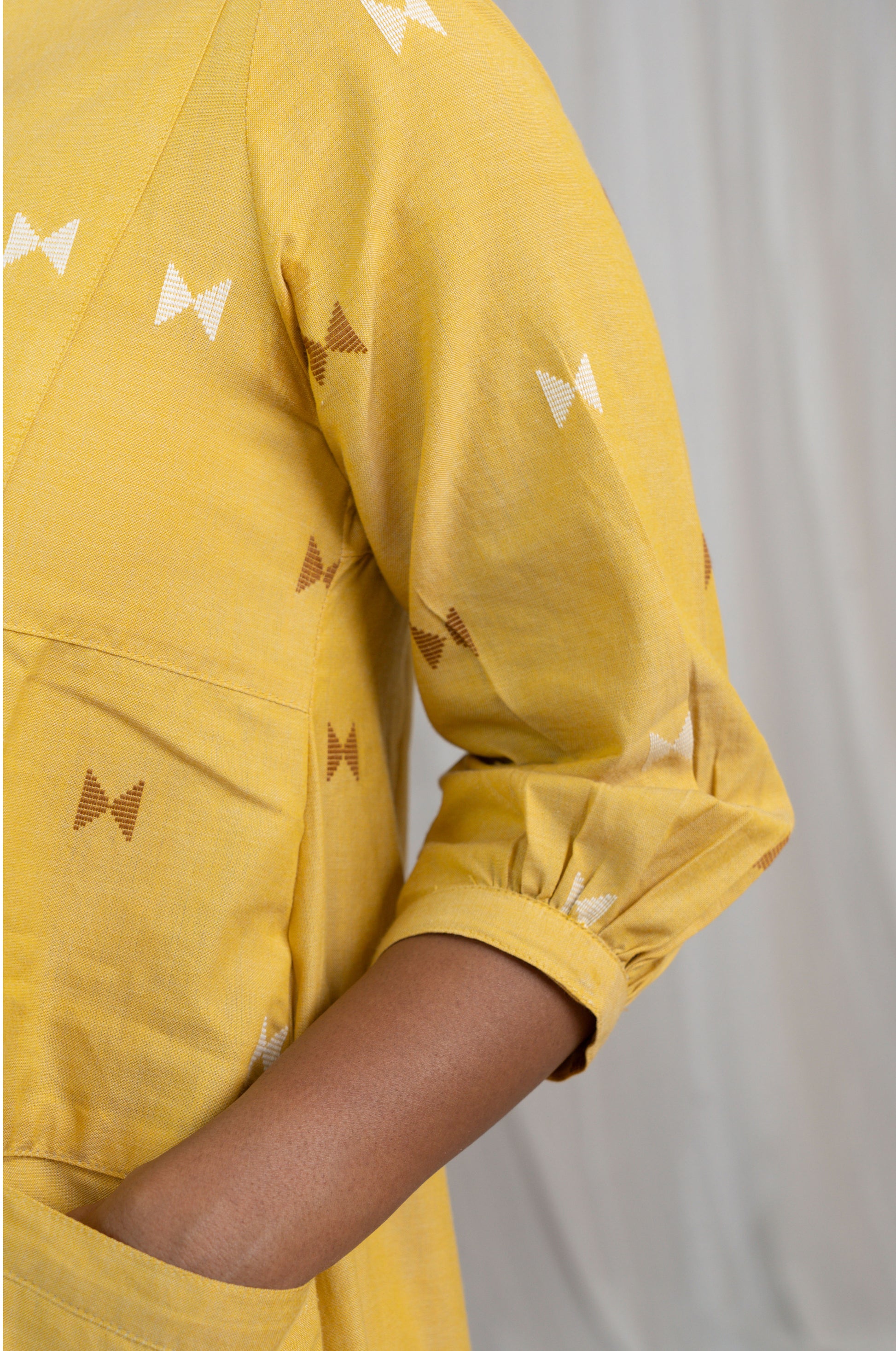 Pleated yoke dress with three fourth cuff pleate sleeve along with two front pockets