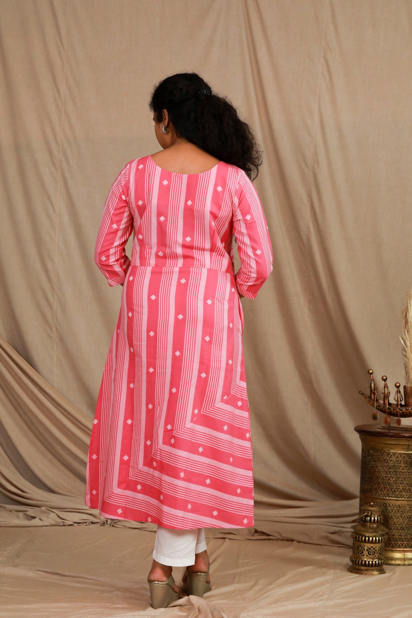 Design: Horizontal stripes patched over the yoke with handwoven butta and asymetric cut over the slit of the garment
